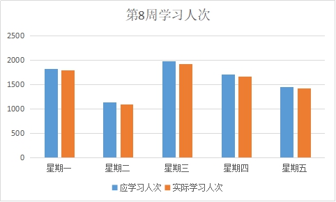 5. 本周星期一应出勤1823人,实际出勤1796人,出勤率为98.52%;星期二应出勤1144,实际出勤1104,出勤率为96.50%;星期三应出勤1979,实际出勤1927,出勤率为97.37%;星期四应出勤1717,实际出勤1664,出勤率为96.91%;星期五应出勤1460,实际出勤1425出勤率为97.60%。具体情况如图5与图6: