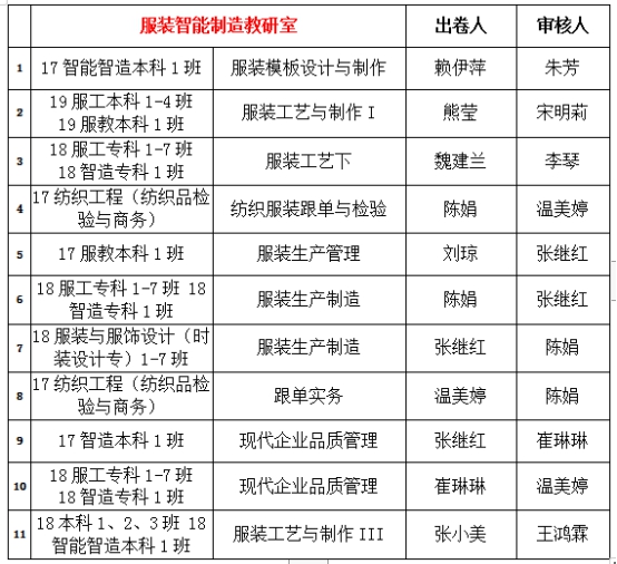 5、整理及核实2020届本、专科毕业生专业课重修员工各类科目信息,根据本学期授课任务合理安排重修课程指导老师,对没有开课的课程,进行课程组研讨然后再安排指导老师,同时要求老师对联系不上的员工,要及时和院教学秘书进行反馈,落实到每位同学。(《服装跟单》课程安排了陈娟老师负责员工免听重修辅导、《服装生产管理》课程安排了张继红、温美婷老师负责员工免听重修辅导、《服装生产实训》课程安排了涂晓明等老师负责员工免听重修辅导、《服装工艺》课程安排了熊莹等老师负责员工免听重修辅导)