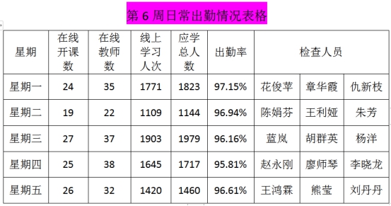 5. 统计好每日线上教学教师数量、开设课程门数、学习人次以及出勤率,本周应学习人次8123,实际学习人次7848,出勤率为96.61%。