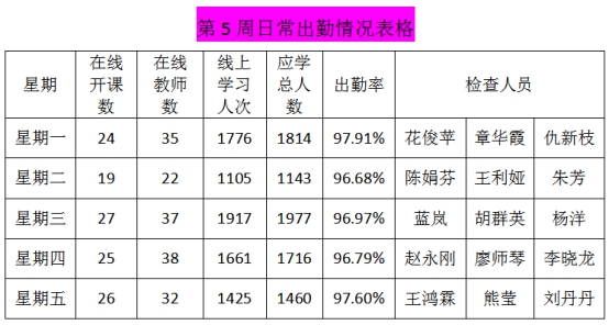 5. 统计好每日线上教学教师数量、开设课程门数、学习人次以及出勤率,本周应学习人次8110,实际学习人次7884,出勤率为97.21%。