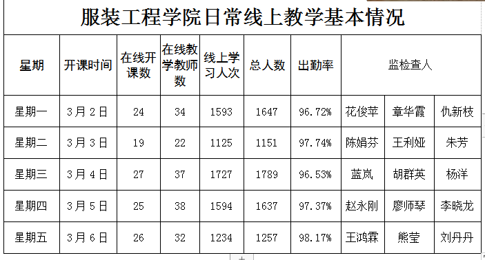 4. 统计好每日线上教学教师数量、开设课程门数、学习人次以及出勤率,报教务处。本周数据如下: