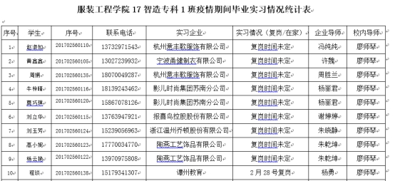 3. 为加强疫情期间毕业设计指导力度,查实和理清毕业设计(论文)进展情况,各指导老师通过线上了解员工复岗情况,并通过QQ/微信等平台准确的掌握每个员工毕业实习情况,收集和核对班级员工实习汇总表。