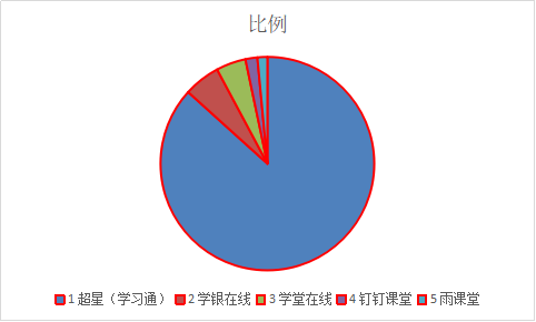 4. 本学期,共计59位老师参与线上44门课程的教学,各班级课程合计达到199门次,建课平台有超星(学习通)(86.70%)、学银在线(5.50%)、学堂在线(4.50%)、钉钉(1.80%)以及微信雨课堂(1.50%)(比例见图1):
