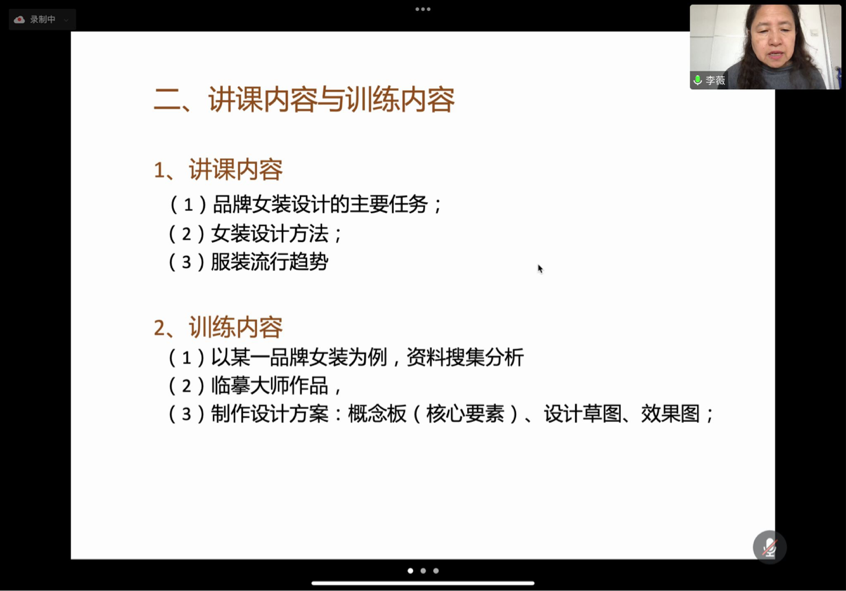 BB贝博艾弗森第四届服装大师班本学期第四周课程于3月19日如期开课,本次开讲的课程是《品牌女装款式设计》,课程教学时间为期两天,由于疫情原因课程采用线上教学的形式,由清华大学美术公司博士生导师、巴黎高等装饰艺术公司访问学者、中华服饰文化研究会理事、2014年中国国际十佳设计师李薇老师主讲。