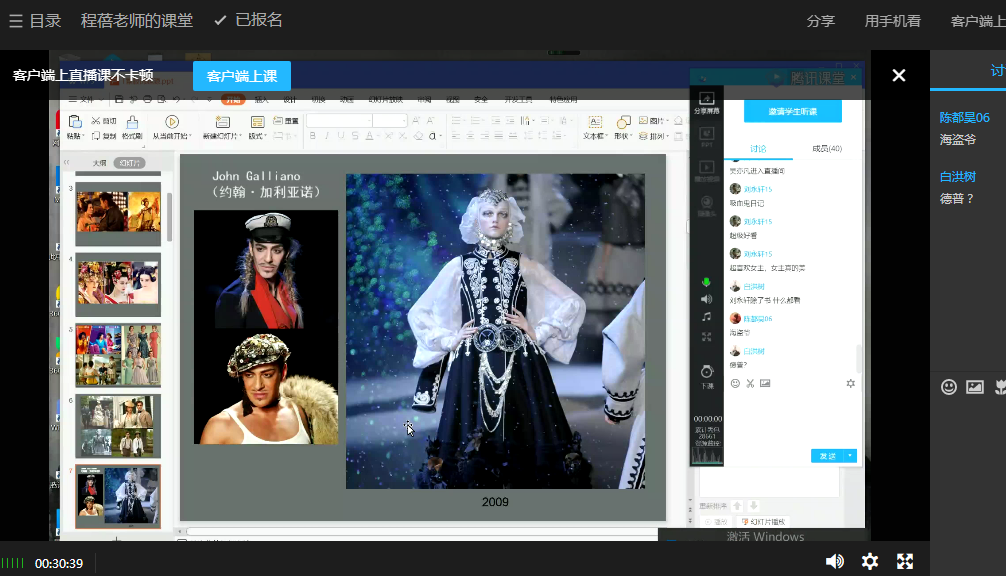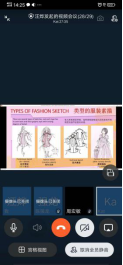 本次听课中汪烨和卡佳老师的《服装画技法》采用双语教学。该课程采用学银在线建课,已将丰富的教学资源上传给员工在线学习,课上老师们采用钉钉进行直播教学。在授课中教师们教学基本功扎实,员工通过观看共享屏幕和讨论区互动,进一步消化和巩固课程内容。