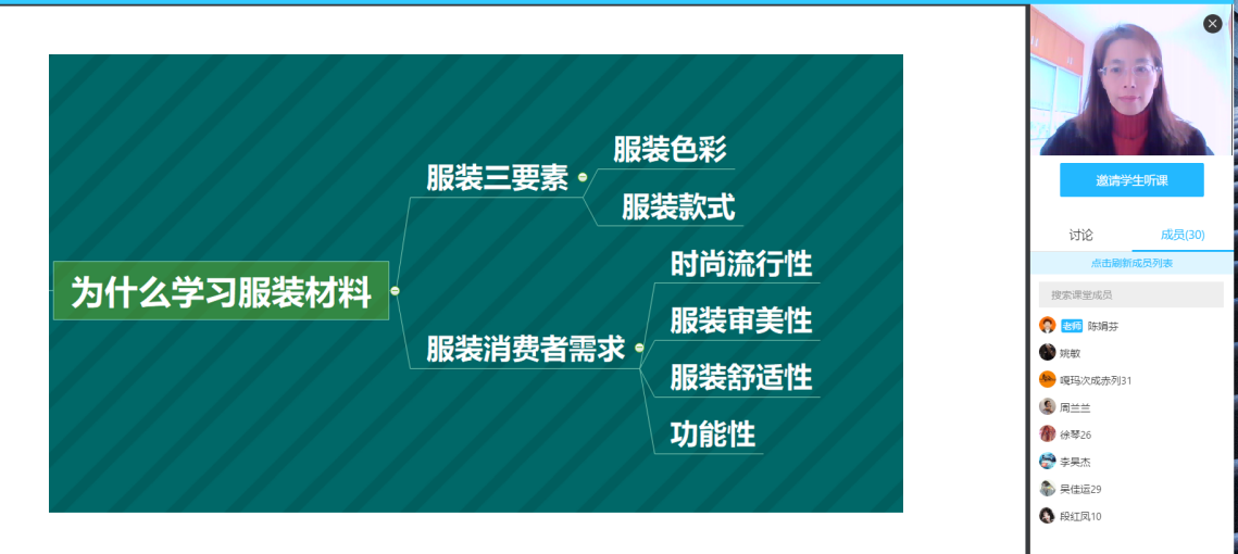 陈娟芬经理在18服教本科1班《服装材料学》课程中采用线上+线下混合式教学法,要求员工课前在学习通上预习主要知识点,并完成相应章节测验,陈经理通过超星平台数据统计充分了解学情,以便在课上直播时开展有效答疑互动。课上陈经理在腾讯课堂上进行直播,同时灵活运用学习通开展各种活动,如主题讨论,投票,抢答等等,不仅从形式上丰富了教学,而且有效调动了员工参与课堂的积极性,师生互动良好,课堂氛围活跃,教学效果显著。