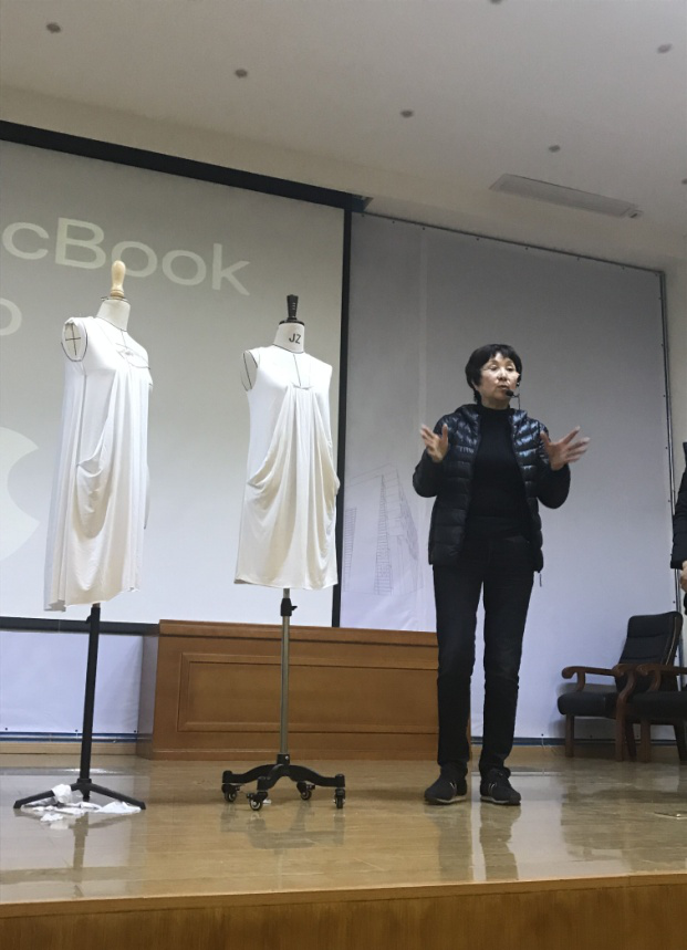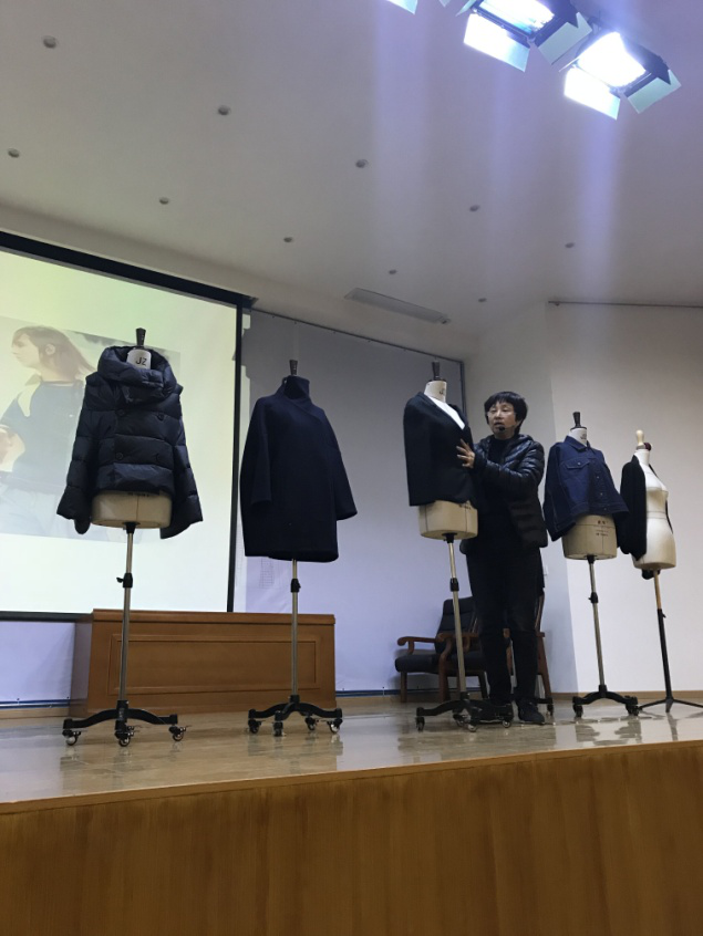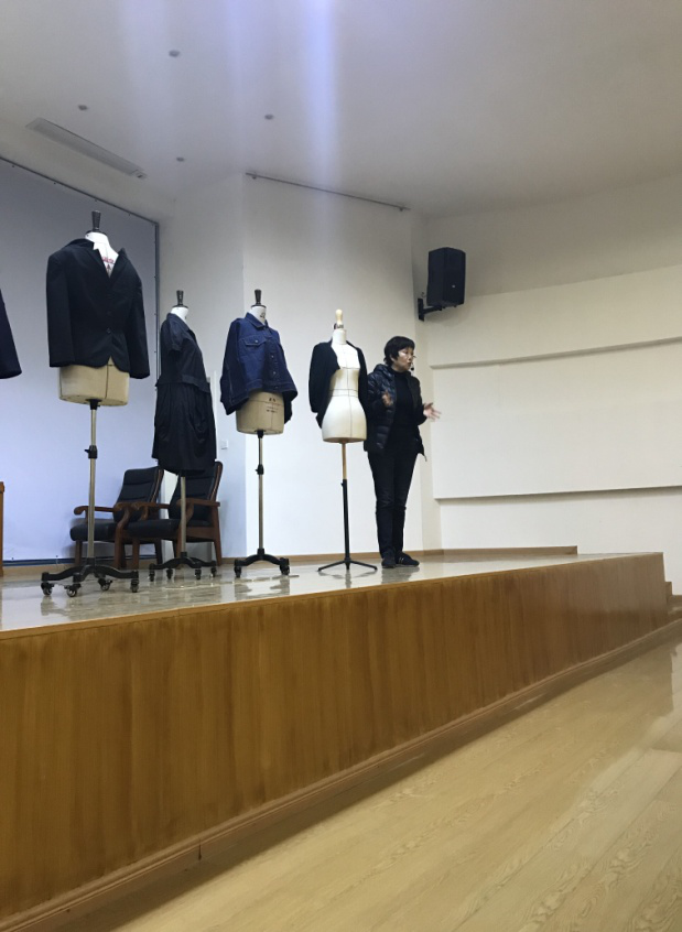 之后,纪琳老师先后以流行元素与品牌风格相结合、刺绣与飞行员夹克、嘻哈风格、朋克风格、解构再造、建筑轮廓、复合破壁、异质同构8个部分为例详细生动讲解了服装版型的设计。同时,在讲解过程中,纪琳老师不时的利用自己携带的品牌衣物在人台上试穿为同学们做了详细的演示讲解,演示了同一件衣服的多种不同穿着方式,例如前后翻转穿着,上下翻转穿着,打开了同学们的设计思路,同时让同学们体会到了版样设计的多种可能性。现场气氛十分活跃,同学们受益匪浅。