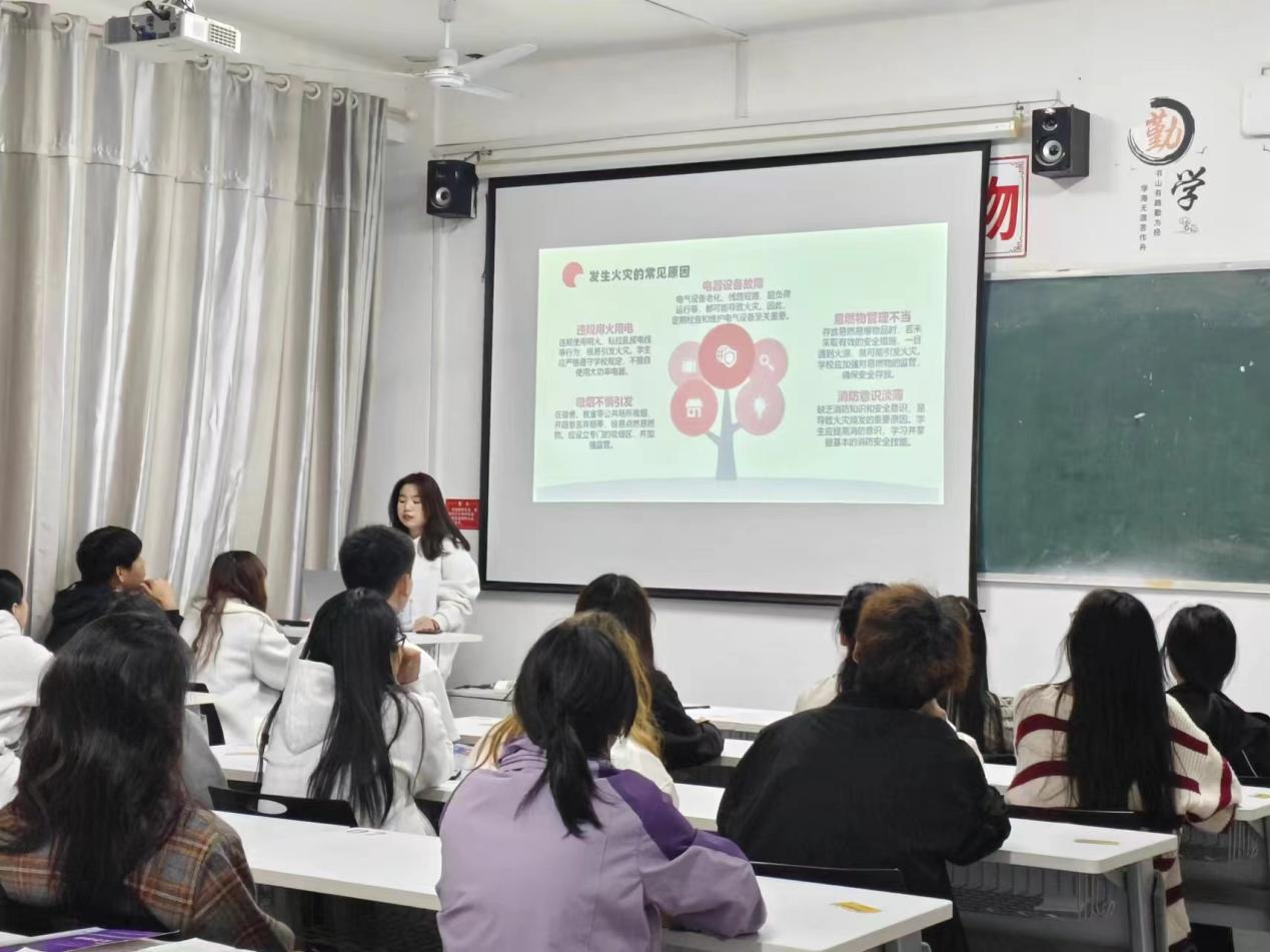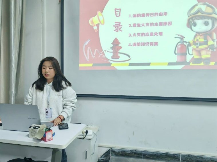 活动开始,首先由张欣怡同学说明每年的11月9日是全国消防日并且介绍了消防宣传日的由来,告诉同学们消防的重要性和了解消防知识的必要性。接着,张欣怡讲述了发生火灾的主要原因,通过几个例子,让同学们更加清楚明白地认知到发生火灾的原因有哪些,例如:电器设备故障、易燃物管理不当、消防知识淡薄和违规用火用电等等。