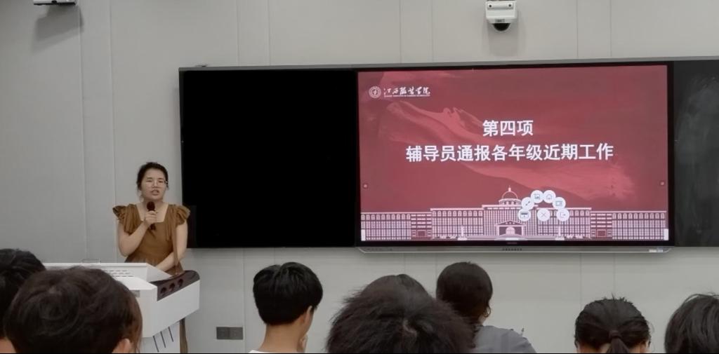 会议第三项,由辅导员布置各年级近期工作。辅导员江青燕和王舒就反诈宣传教育工作、家庭经济困难认定工作、就业摸排工作等近期工作进行了布置,并要求各班级今后要及时传达工作任务,保质保量完成各项工作。