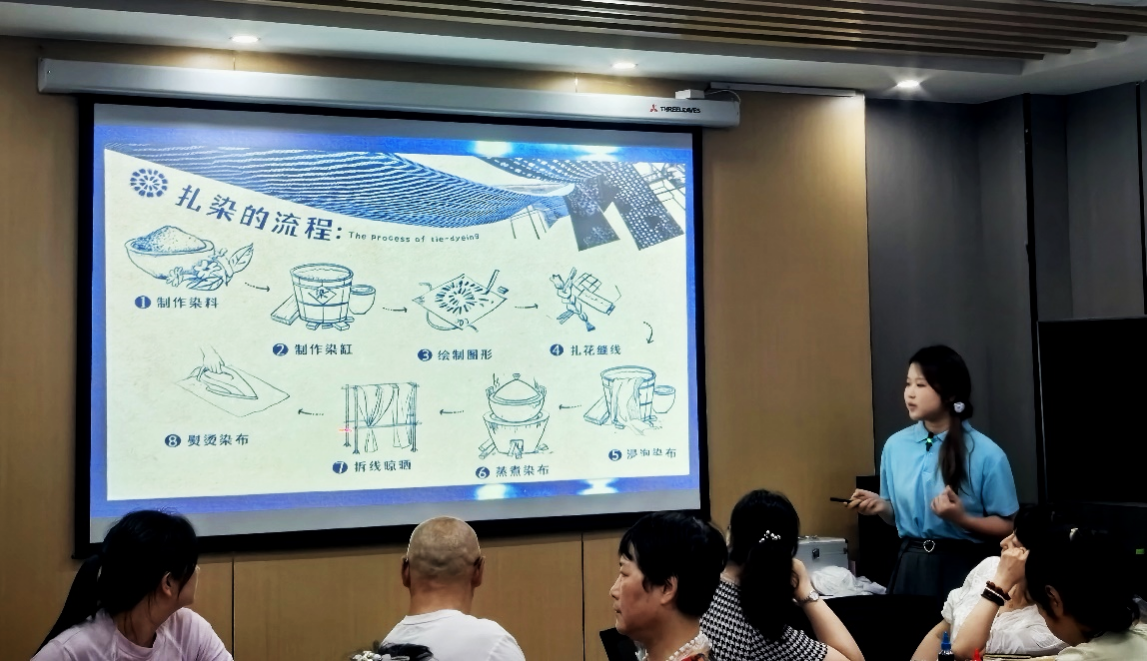 活动伊始,由“寻裳”中华文化传承团队员张邵琪进行扎染技艺宣讲。张邵琪详细从扎染起源、扎染图案与扎染的工具使用等方面对扎染技艺进行了详细介绍。同时,通过随机提问与活动现场的社区居民进行互动,活跃了活动气氛,也加深了居民们对于扎染技艺的理解。