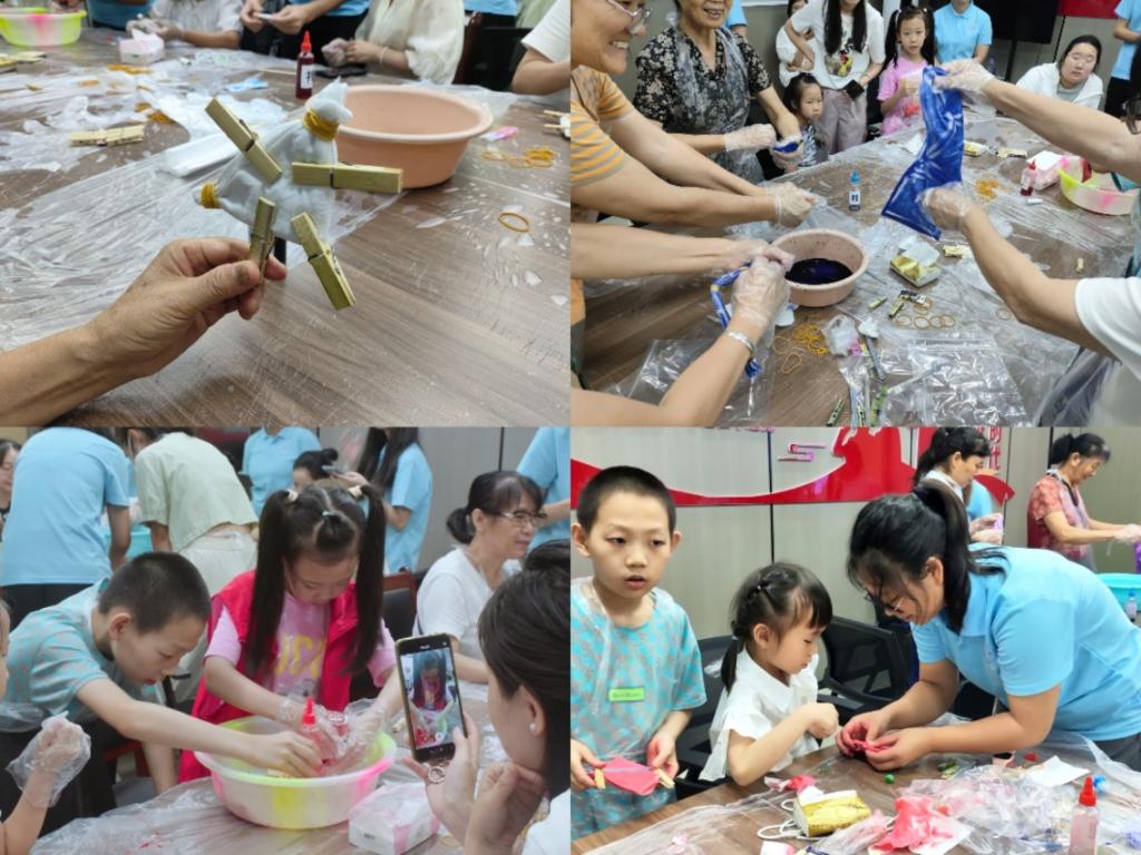 讲解结束后,居民们参与热情高涨,都迫不及待的要开始动手尝试扎染。在队员的指导下,他们或独自创作,或亲子合作,将一块块洁白的布料根据自己的想象和教学的方式,通过纱、线、绳等工具,对织物进行扎、缝、夹、折叠、缠绕等多种形式的组合,扎结,然后浸入染料中。随着染料的渗透与扩散,一块块独特的扎染作品逐渐呈现在大家面前。打开成品的瞬间,仿佛开启了一个个色彩盲盒,每个人的作品都是独一无二的艺术品。