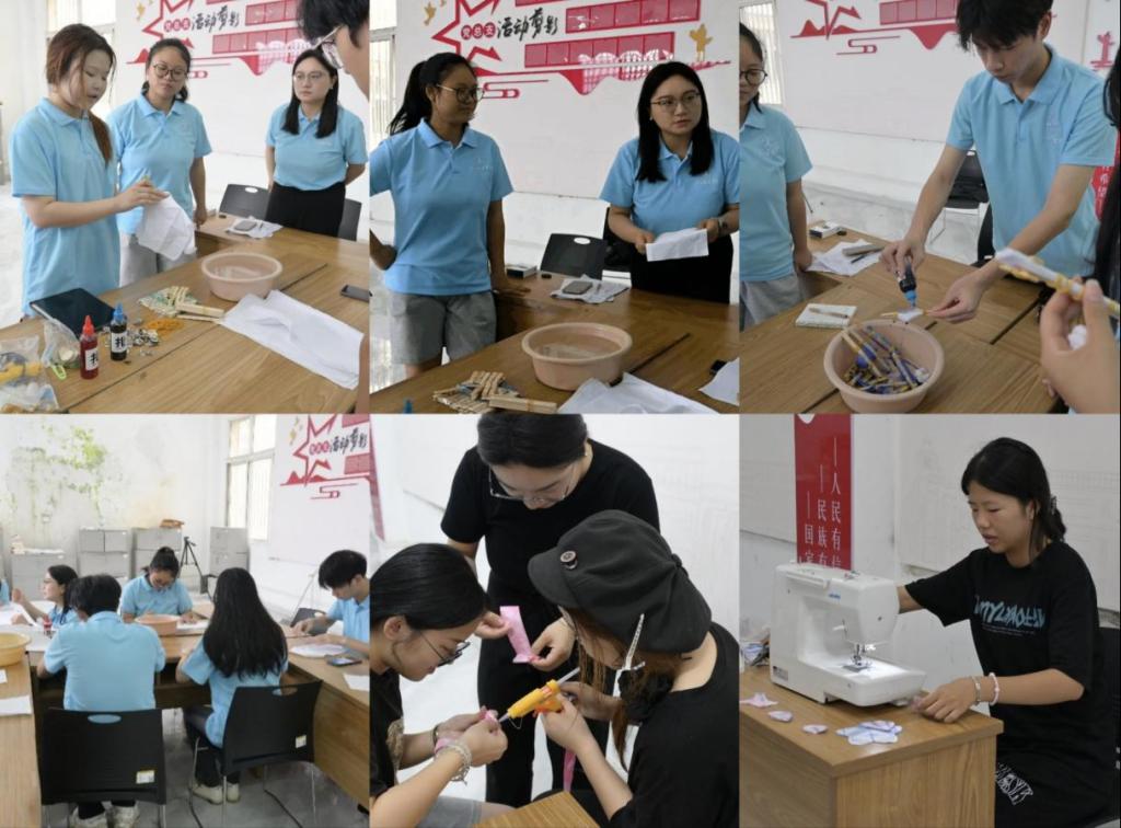 仪式第三项,进行出发前材料准备。基于前期活动策划、人员分工、任务部署的有效落实,团员成员有条不紊地进行活动材料准备。准备活动中,张邵琪向团队成员讲解了扎染的基本原理以及扎染工具的使用方法。通过张邵琪的讲解及演示,志愿者们开始进行扎染实操,在捆扎定型后进行染色晾晒。最后经过布艺手工制作,制成一份份精美的活动礼品。