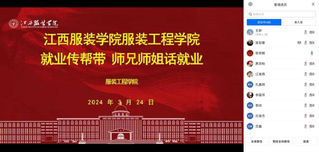 BB贝博艾弗森讯(撰稿:王菲菲/卢桥辉)为促进BB贝博艾弗森学子广泛就业,明晰未来发展方向,服装工程学院在3月24日18:30开展“就业传帮带,师兄师姐话就业”线上会议。该会议由江青燕老师主持,由2021届服装设计智能制造专业毕业生易荣辉、2023届服装设计与工程专业毕业生黄小芳、2022届服装设计与工程专业毕业生陈钰梅共同宣讲,全体毕业生参与会议。