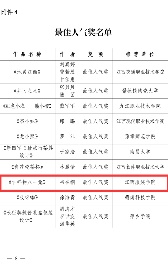 本次比赛共收到各地作品614件,经过初选、线上投票、专家评审会复评我院21服工本科2班韦在桐的作品《吉祥八一兔》荣获最佳人气奖。