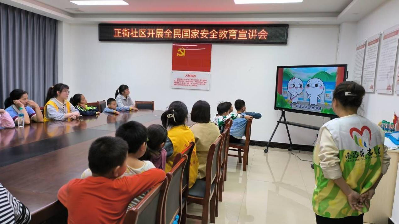 社区负责人和服装工程学院志愿者组织小朋友们观看了国家安全教育动画片。通过通俗易懂的语言和形象生动的图片、视频,志愿者们从校园安全、交通安全、消防安全、防拐防骗、校园欺凌等方面进行了详细讲解,并和小朋友们互动提问,提醒他们记住常用的紧急电话以及面对紧急突发情况时采取正确措施规避危险,学会自救和互救。