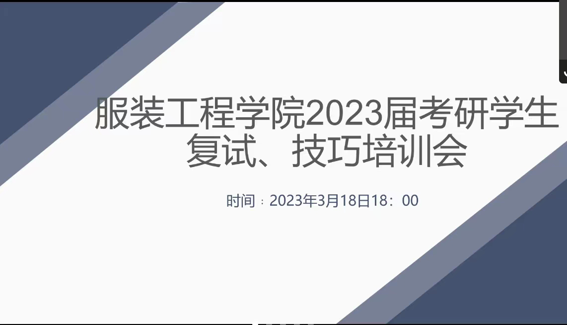为了助力服装工程学院2023届毕业生们考研上岸,缓解复试备考压力,增强员工的必胜信心,帮助同学们更好地了解复试流程与关键要点,3月18日晚6:00,服装工程学院以腾讯会议的形式组织召开了2023届考研员工复试、技巧培训会,辅导员王舒、江青燕、卢永红,2023届考研拟复试员工以及2022届考研上岸的几位学长参加了本次会议,会议由公司党委书记彭波主持。
