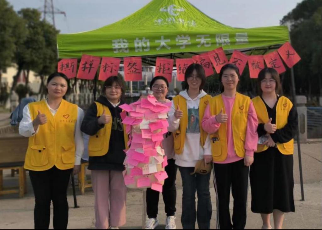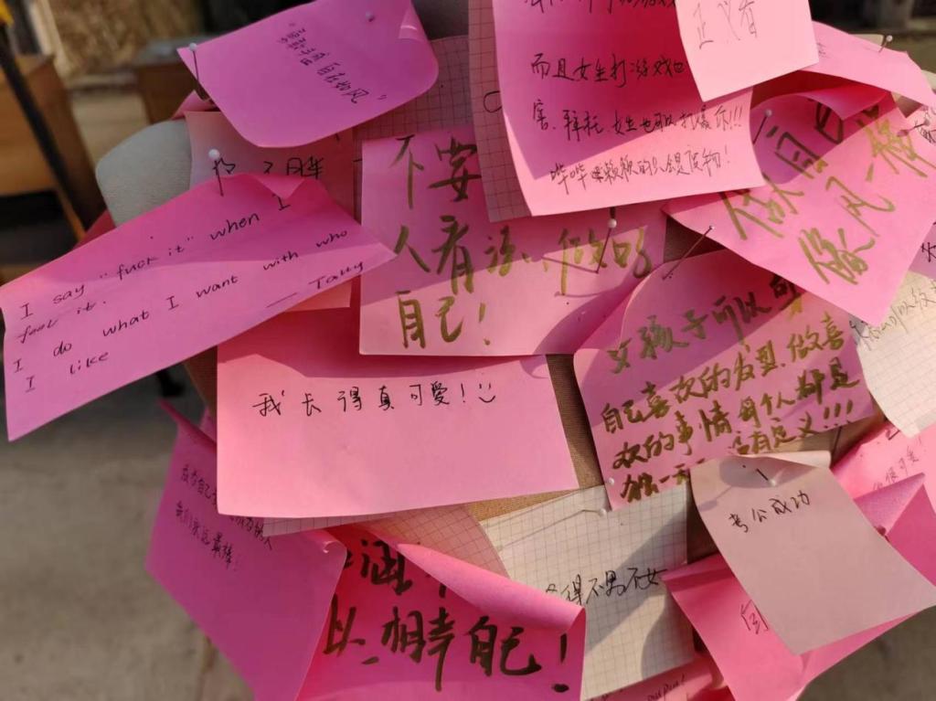 同学们打出了本次活动的标语:“撕掉标签”“拒接偏见”“不被定义”。如今,被打上标签,被定义是一件经常却又无可奈何的事情,而女生往往也会被打上各式的标签。公司志愿者们在现场准备了简笔贴和人偶架,并向路过的同学们解释本次活动的目的。路过的同学们纷纷把人偶上的定义标签撕下来,写上“做真实的自己”“拒绝焦虑”“你很漂亮”以及对自己未来的期望等语句。