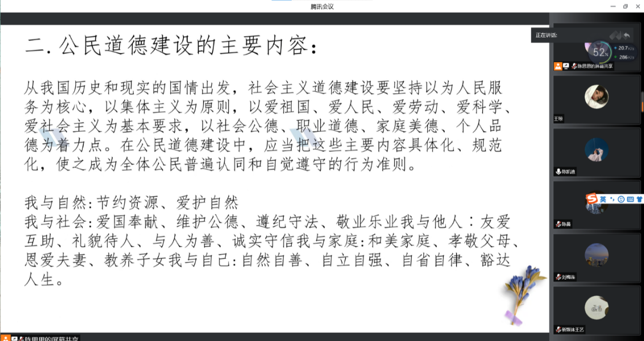 活动从“公民道德宣传日”的内涵、所包括的内容、设立“公民道德宣传日”的目的和意义,以及作为新时代青年应如何树立正确的道德观五个方面展开。