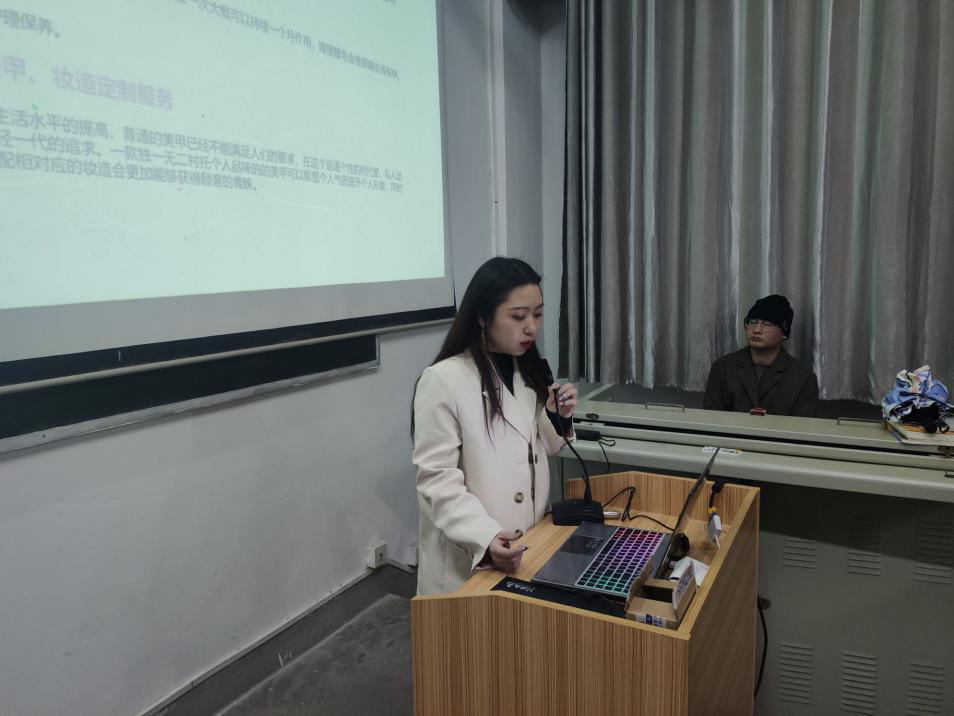 本次比赛参赛队伍共十支,来自于不同的班级。参赛队伍的精彩展示,让在场的老师们和同学们眼前一亮。比赛过程虽激烈,但也不缺乏新颖思维的发散,有创艺美甲、服装造型、摄影制作、自然科学教育等不同的创新创业想法。选手们上台展示出来的青春活力,对观众们的滔滔不绝,对创新创业的独特见解,更是赢得了老师们和同学们的热烈掌声。随后,学工办副主任洪婷老师进行精彩的点评,她认为每位参赛选手的参赛项目都具有较强的发展空间,强调在未来的深入探索中应针对项目的不足之处进行详细的梳理,并希望同学们通过此次创新创业大赛,不断提高自身在学习工作中的认真性和严谨性。