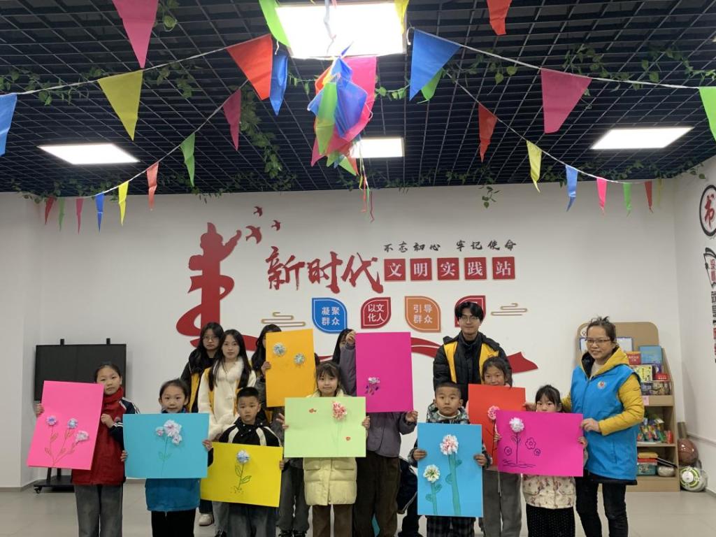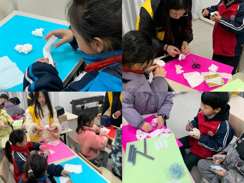 接着,志愿者们开始分组与孩子们进行互动——纸巾永生花。志愿者们与小朋友们分工合作,将纸巾对折,卷出花片,再将单独花片进行组装上色,大家发挥各自的创意,展现出永生花的与众不同,孩子们在志愿者的陪伴下,玩得不亦乐乎,脸上洋溢着幸福的笑容。志愿者们的手工制作不仅丰富了小朋友们的精神世界,还拓展了小朋友们的动手能力。