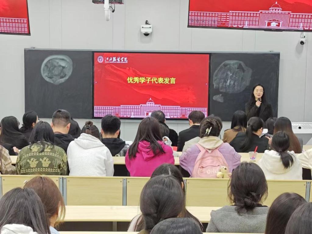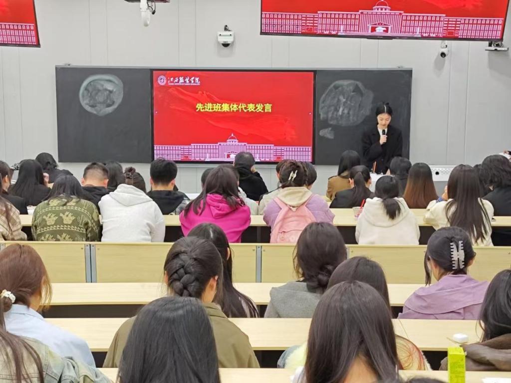随后,由先进班集体代表23服工本科2班的曾茜发言。曾茜讲到,大家从初识的拘谨到现在的亲密无间,从懵懂迷茫到携手共进,班级同学始终以团结奋进、责任担当为班风,用行动诠释着集体的力量。大家还树立了一人成长带动集体进步的目标,通过班委协作、小组互助等形式,营造出人人有事做与事事有人担的集体氛围。曾茜表示,他们深知成绩的背后,离不开集体的智慧,他们还特别注重全面发展,班级成员活跃于各种活动中。他们会站在新的起点上,继续秉持积极进取、奋勇向前的精神,以全新的面貌和更坚定的信念,在追求卓越的道路上奋力奔跑。