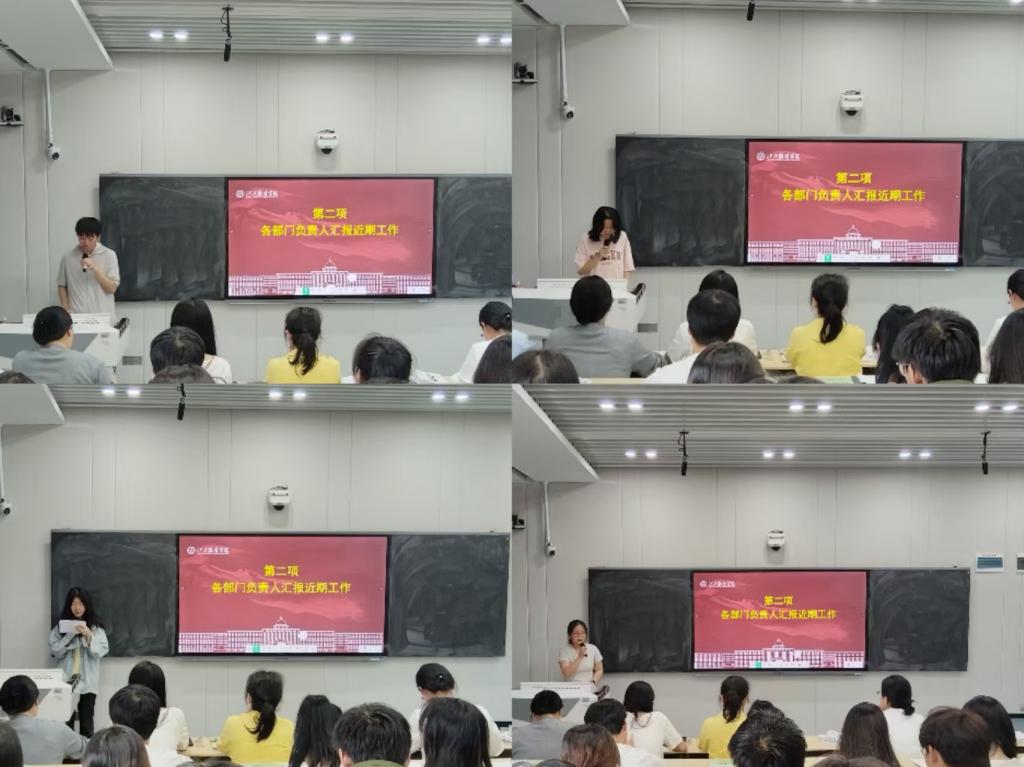 会议第二项,由班委联合会会长及各部门负责人汇报近期工作。各位负责人详细介绍了各部门的工作进展,包括各班级卫生管理情况、每周主题班会召开情况等。各部门一致表示,在接下来的工作中还要不断提升工作质量,保证各部门之间相互协助,致力于提升班级整体素质。