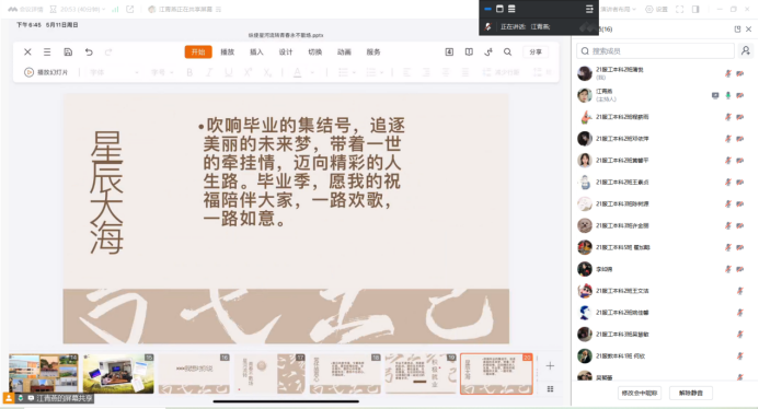 接着班主任通过线上文档展示详细介绍了毕业典礼的流程、参与方式和时间安排。谈到文明离校,班主任强调,要遵守公司相关规定,妥善处理个人物品,做好宿舍卫生,以文明的方式为老员工活画上圆满句号。