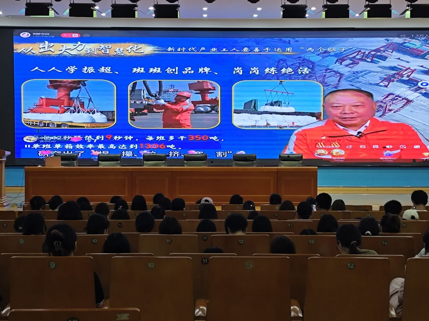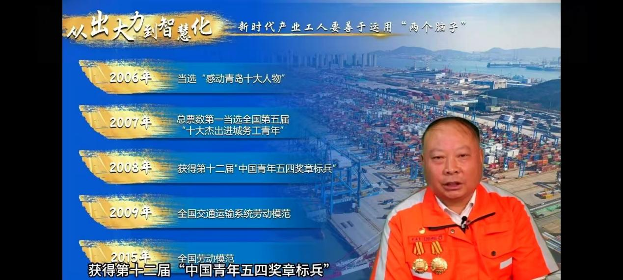 皮进军分享了他是如何从一个来自山沟沟里的农民工在港口码头上读懂并践行“劳动”的分量、“工匠”的温度,走出他的奋进之路。他讲到,从山沟沟里到大码头,命运不会辜负拼命奔跑的人。皮进军小时候家里贫穷,全家八口人仅靠着山沟沟里的3亩6分地过着穷苦日子,因此16岁的他只能辍学四处打工。过了几年,命运的转折点出现了他的19岁,皮进军成了青岛港的一名普通装卸工,从此点亮了他人生的梦想,他深知工作来之不易,面对各种脏活累活他都抢着干,由于工作强度大,许多和他一起来的农民工坚持不住,离开了那个工作岗位,但是皮进军咬牙坚持了下来。师傅们赞赏他的坚持和努力,自愿教他装卸技能,后面皮进军靠自己的努力当了班长,成为了公司装卸生产的“行家里手”。他表示,技能是练出来的,本事是拼出来的,不管将来干哪一行,不怕起点低,就怕不学习、不钻研、不奋斗,只要大家脚踏实地,干一行、爱一行、精一行,就一定能在平凡工作中,绽放自己的人生精彩。