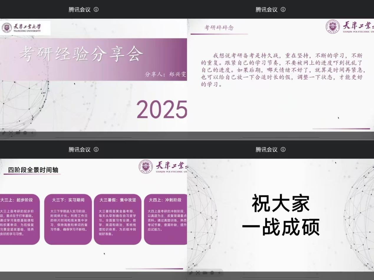 首先,由就读于天津工业大学的郑兴雯同学分享,她从个人情况、院校选择、备考经验以及个人心得感悟四个方面作了分享。郑兴雯首先讲到个人情况,由于现在这个时间段,大家都有了自己想要选择的院校,因此她直接进入了备考经验的分享阶段。她的备考阶段主要分为大三上的起步阶段、大三下的实习阶段、大三暑假的集中攻坚阶段以及大四上的冲刺阶段。她表示,起步阶段重点在于打牢基础,为后续复习奠定坚实基础,到了实习阶段,时间碎片化,充分利用空闲时间,确保学习不断档,之后的时间全面复习专业课,查漏补缺,熟悉考试节奏,提升适应能力。郑兴雯还分享了专业课三轮进阶背诵术和公共课三科收官策略,主要就是要熟悉考试题型,提升应试能力。最后郑兴雯提醒大家,要稳住心态,不比较不侥幸,考研备考是持久战,重在坚持,不断地学习,不断地重复,要跟紧自己的学习节奏,不要被网上的进度吓到扰乱了自己的进度,后期也可以适当给自己放个小假,调整状态,这样才能更好地学习。