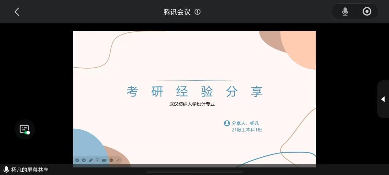 随后,由就读于武汉纺织大学的杨凡同学进行分享,她主要从考前心态来分享自己的心得。杨凡表示,不能过于焦虑,不要轻视对手,但也别低估自己,压力大就去放松,一定要释放自己的负面情绪。杨凡强调,网络可以弥补信息差,但是也会在无形之中给你施加压力,大家要理性看待网络信息,少关注别人,多关注自己,每个人都会被各种琐事打扰。最重要的一点就是,为最差情况留一个退路,复试面试失败只为了积累胆量和经验,不要为了一时的失败就没有前进的动力。杨凡最后送给大家一段祝福:吃好、睡好、保证身体好,预祝大家成功上岸。