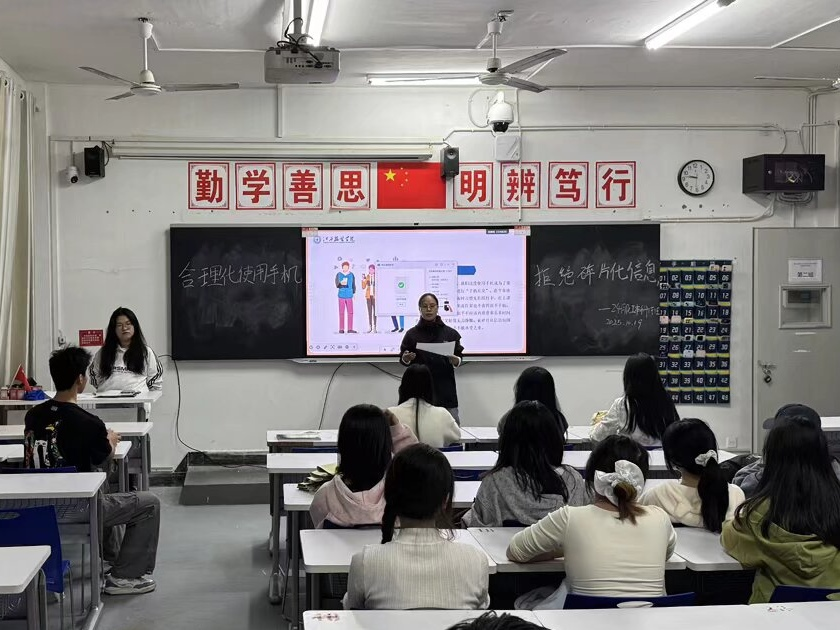 24级各班级以“合理化使用手机 拒绝碎片化信息”为主题召开班会。班会伊始,班长们指出手机角色转变及碎片化信息挤占学习时间的现状,组织大家观看了《放下手机》视频,揭示过度使用手机导致的作息紊乱、沟通能力减弱等问题;随后结合案例与数据分析了其危害,包括手机“快反馈”机制对深度思考能力的削弱、超六成受访者存在注意力分散现象,以及2024年中国手机用户日均使用时间预计达4小时37分钟等数据,并引用美国相关调查,阐释“垃圾快乐”的潜在负面影响;接着,班会分享了减少干扰、增强功能、高效阅读与转换定位四大科学用机策略;最后以乔布斯家庭管理电子产品的案例为例,呼吁同学们做手机的主人,回归现实交流,共同营造积极健康的校园氛围。
