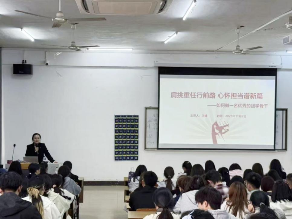 作为2007年启动的青年骨干培养重点项目,“青马工程”绝非抽象概念,而是扎根实践的成长沃土。洪婷以《觉醒年代》中陈延年、陈乔年等革命先辈的事迹为引,阐释了不同时代“青马先锋”的共同特质——坚定信仰与责任担当,引发在场学员对“青年使命”的深刻思考。针对团学工作中的实际困惑,洪婷还明确了骨干的三重核心身份:以学习为根本的“员工”、以服务为天职的“团学骨干”、以创新为标签的“青年先锋”,并强调“不是因优秀而成为骨干,而是因成为骨干而更优秀”。同时,洪婷直指“官本位”“功利心”“瞎忙活”三大常见问题,倡导骨干们以“桥梁者”姿态服务同学,坚守初心、目标导向。