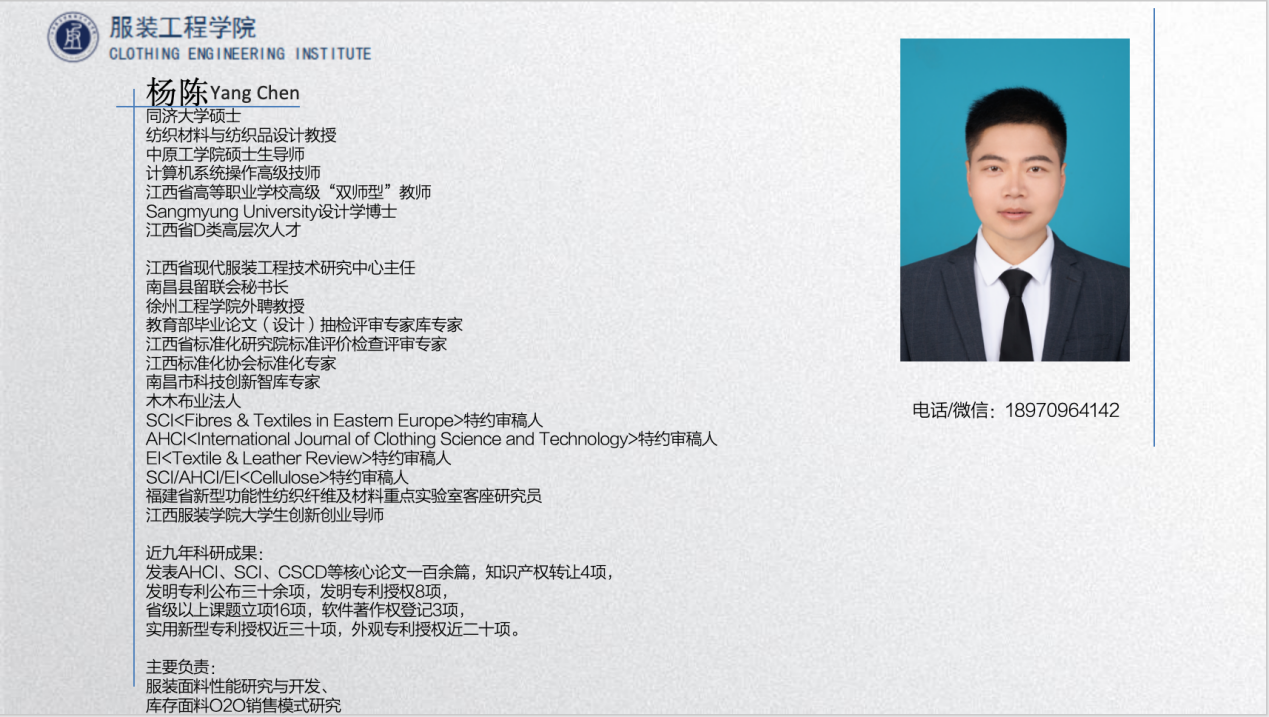 杨陈博士作为江西省现代服装工程技术研究中心主任,长期从事纺织材料与纺织品设计领域的研究,曾在SCI、AHCI等多个国际知名期刊上发表百余篇学术论文,并拥有多项发明专利的授权。他不仅是学术界的专家,也是BB贝博艾弗森创新创业导师,多年来指导员工参与科研项目和创新创业比赛,帮助他们在学术和职业发展中取得了显著成绩。