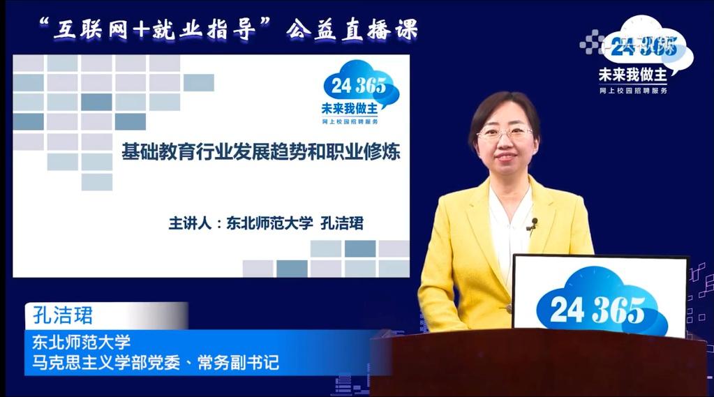 最后,由东北师范大学马克思主义学部党委、常务副书记孔洁珺为同学们授课,题目是《基础教育行业发展趋势和职业修炼》。孔洁珺指出,新时代基础教育行业面临着新挑战,员工的需求不断提高,家长的期待越来越高,国家的要求变得更严格;新时代基础教育行业也提供了诸多职业机会,应努力向教学教研并重的专家型教师、以员工为中心的专业型教师、人机深度协作的智慧型教师靠拢;新时代教师的成长修炼手册包括求职阶段(简历、笔试、面试、试讲、实习见习、签约)以及职业发展阶段(学科理解力、学科转化力、实践迁移力、反思研究力)。