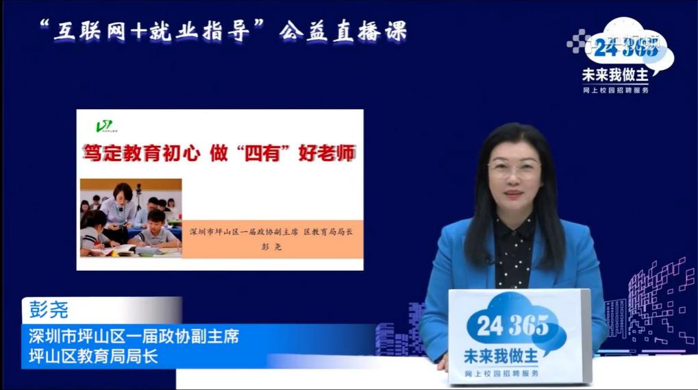 随后,由深圳市坪山区一届政协副主席、坪山区教育局局长彭尧为同学们授课,题目是《笃定教育初心,做“四有”好老师》。彭尧从“新时代呼唤什么样的教师”“各地校招教师有哪些方式”“教师专业发展有哪些路径”三个方面展开讲述。彭尧强调,教师应具备政治觉悟、洞悉世界、创新思维、跨学科思考、综合审美、因材施教六大素养;校招的主要方式有市或区教育局统筹进行招聘、由公司自主进行招聘、教育局与公司联合进行招聘;教师专业发展的路径有积极参与区域教师培养计划和教师个人的努力和坚持。