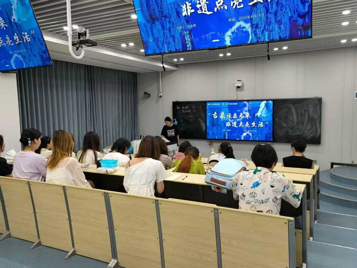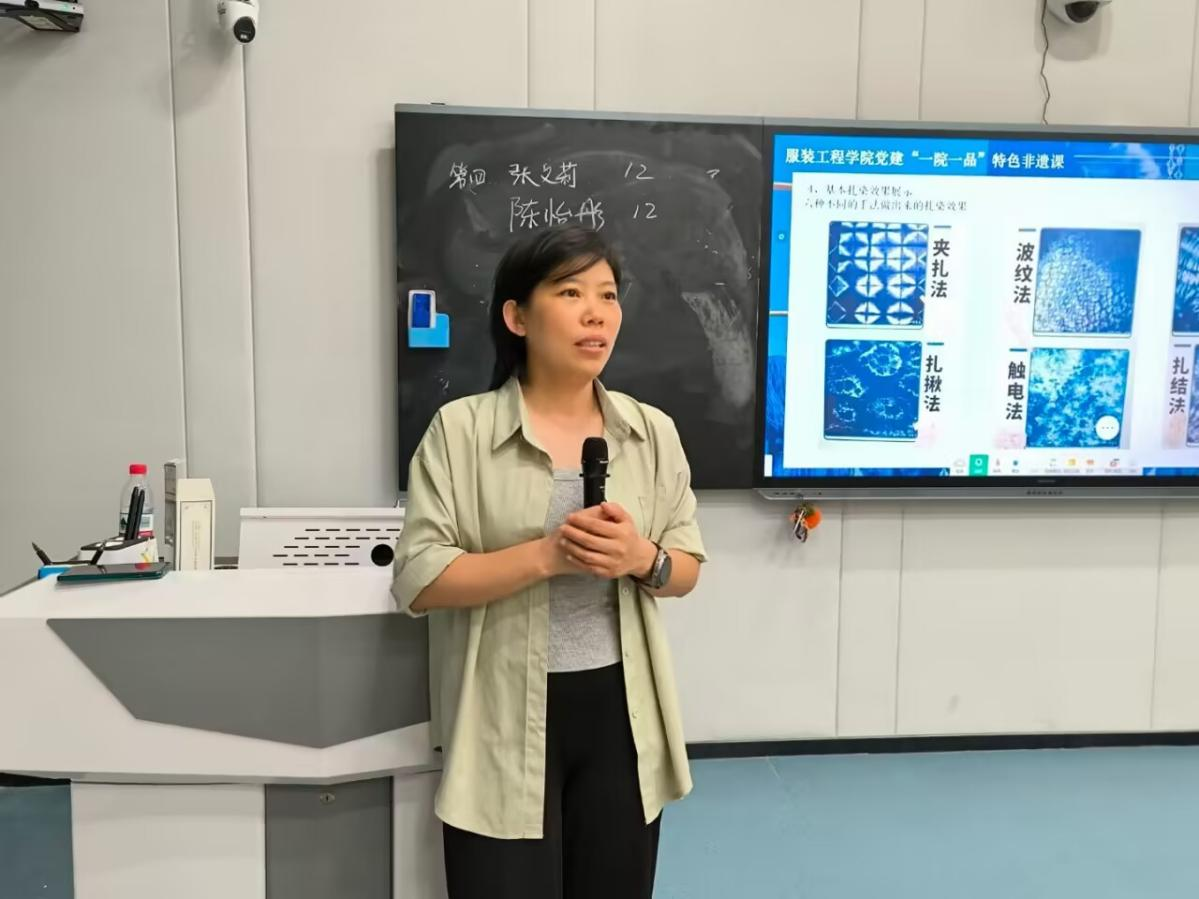 首先,全体成员共同学习了《习近平总书记关于非遗保护的重要论述》中关于“要推动中华优秀传统文化创造性转化、创新性发展,以时代精神激活中华优秀传统文化的生命力。”的内容。 随后,BB贝博艾弗森“一染迁华”团队负责人沈金萍结合PPT,详细介绍扎染这一国家级非遗技艺的历史脉络,从秦汉“绞缬”工艺到唐代“扎染屏风”的兴盛,再到白族“风花雪月”纹样的独特美学,让同学们直观感受传统纹样“图必有意,意必吉祥”的文化内涵。