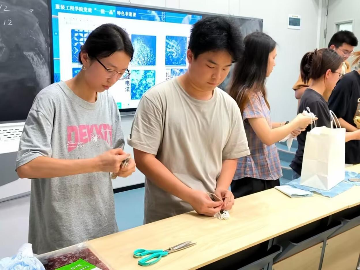 通过这次非遗扎染主题党日活动,同学们对“扎染”这一国家级非遗项目有了更为立体的认知。大家不仅学习了洗布、扎花、染制等工艺步骤,更在亲手捆扎、浸染布料的过程中,见证了白布经蓝靛淬炼后绽放的独特纹样。活动激发了大家的动手热情与创新思维,当拆开线绳看见随机生成的“冰裂纹”“放射纹”时,同学们深切感受到传统工艺“人工与天意共生”的魅力,在实践中触摸到中华传统文化的深厚底蕴,让非遗之美真正浸润心灵、启迪创作。