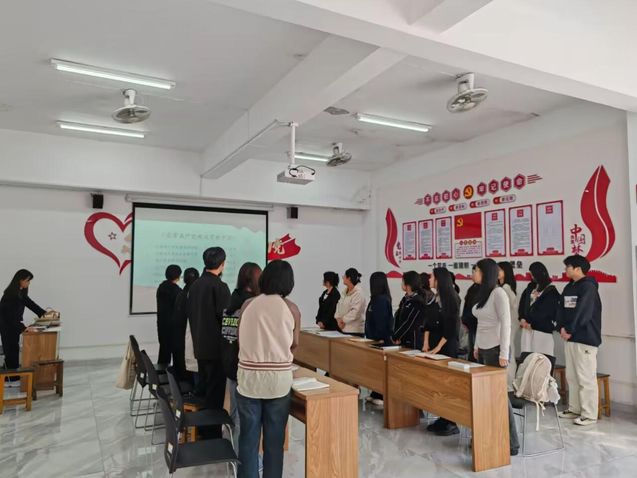 会议第一项,全体起立,齐唱《没有共产党就没有新中国》。