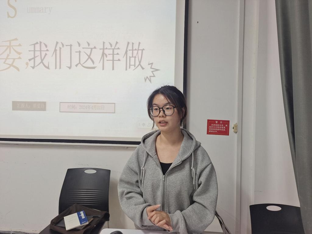 会议开始,胡爱玲同学“心委,我们这样做”为主题,着重讲解心理委员在面临同学心理健康问题时需做出的行动。首先,她讲述了心理的概念,并且表示保持心理健康是同学们正常参与校园生活的前提。其次,她对心理委员角色定位和职责做了分析,她认为心理委员是同学们的倾听者、连接同学和老师之间的桥梁、集团心理健康系统中的一份子,对班级乃至校园都是不可或缺的一部分,同时他们也肩负起为同学们解忧、及时传递信息等重要职责。再次,她还分析并指明了班级内需重点关注的群体,像有经济困难、学习困难或经常有情绪困扰的同学都需要心理委员对的行为和情绪多加关注。最后,她强调了心理委员在发现问题时应及时报告老师,以便问题及时得到解决。不仅如此,心理委员还要遵循保密原则,保护同学的个人隐私。心理委员敢要经常学习和宣传心理健康知识,提升本班级员工的心理健康水平还要协助公司的心理健康教育与咨询工作,为公司心理普查和调查问卷的正常开展打下基础