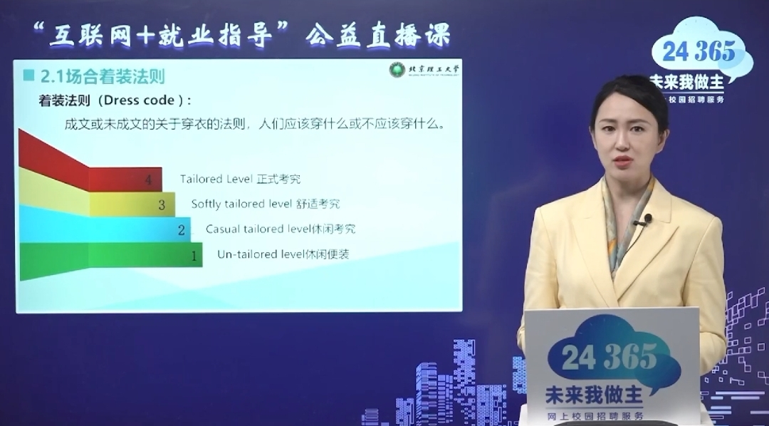本次直播课由北京理工大学就业指导中心主任助理田静主讲田静PPT的形式讲解了求职期间的仪容仪表的重要性田静强调,服装不能塑造出完人,但第一印象的80%往往来自于你的着装。田静表示,面试第一眼感官很重要,着装风格决定了面试官对求职者的第一印象,得体大方,干净利落会让你获得更多的欣赏。同时,头发梳整齐,皮鞋要擦亮,男同学胡子要刮干净,注意头皮屑,女同学不要浓妆艳抹,不要用太浓烈的香水等也是求职附加分的一部分。最后,田静从求职程序的角度为大家进行了总结,针对不同场合要进行合理地自我约束,要注重自我语言的合理表达,要有在大家面前说话的勇气,从容大方迎接面试。