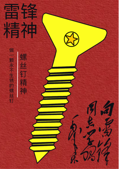胡锐同的作品以“螺丝钉”为主题,黑红为主色。一颗钉子,看似没什么了不起,但雷锋充分发扬善于挤、善于钻的“钉子精神”,在并不起眼的岗位上干出了不凡事业我们在学习生活上,要学习钉子两个长处:一是挤劲,是钻劲的精神,善于挤和善于钻。让我们做一颗永不生锈的螺丝钉!大力弘扬奉献精神,把自己的小我融入祖国的大我、人民的大我之中,每个人都能为强国建设、民族复兴伟业添砖加瓦。