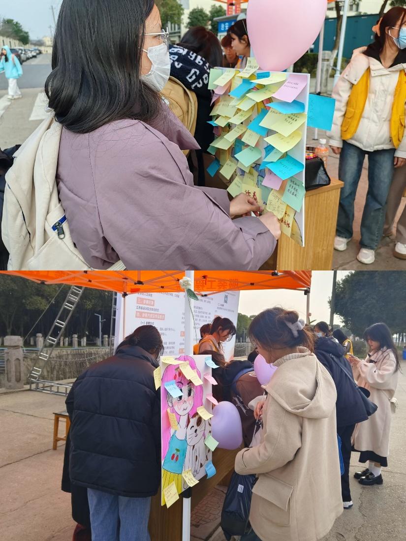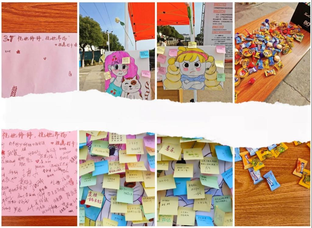 活动现场,一个卡通女孩人形板表面贴满了各式各样的祝福贴纸,每一张贴纸都承载着对女性的赞美与祝福。参与者们纷纷上前,挑选自己喜欢的祝福贴纸,同时也留下自己的祝福。