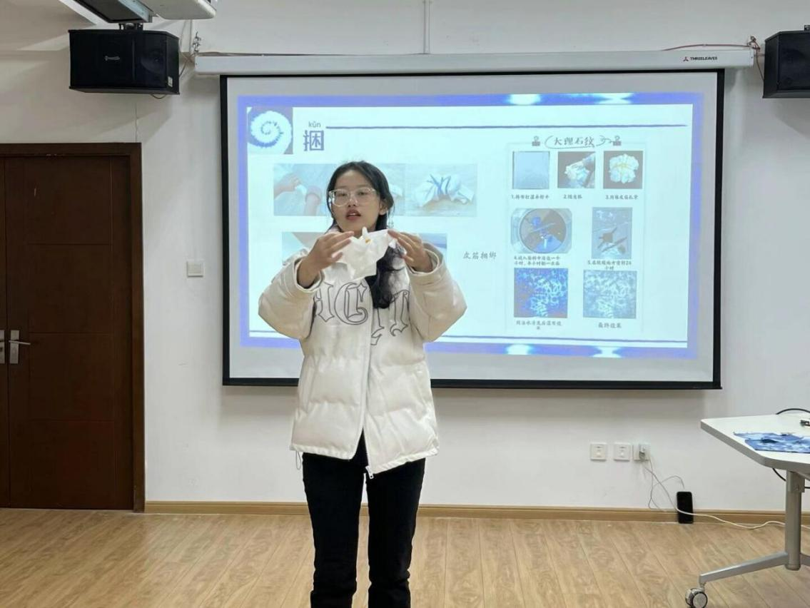 扎染,古代又称扎缬、绞缬、夹缬。2006年,扎染技艺入选首批国家级非物质文化遗产。刘梅连为大家介绍了扎染的基本知识,扎染的制作步骤是洗布——扎花——调制染液——染布——清洗,并带领同学们欣赏了素朴雅致、图案多样的扎染作品。
