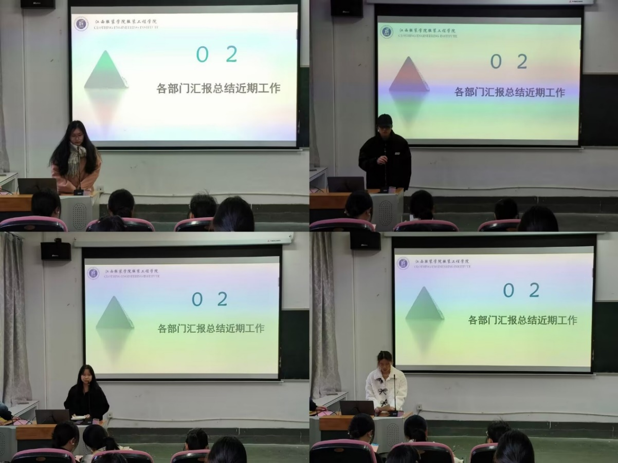 会议第二项,由班委联合会各部门负责人对近期工作进行了汇报,并指出了存在的问题及解决方案。针对请假、考勤等问题,各部门表示要注意工作细节,做好工作的同时,也要关心班级同学的学习、生活状态。
