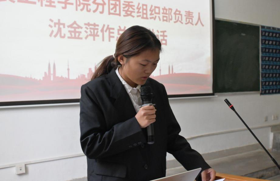 活动第三项,分团委组织部负责人沈金萍发言。沈金萍讲到,新时代青年,心中要时刻装着大局,以党和人民的事业为重,在矛盾和困难面前敢于迎难而上,在危机面前勇于挺身而出,努力为党和人民的事业做贡献。