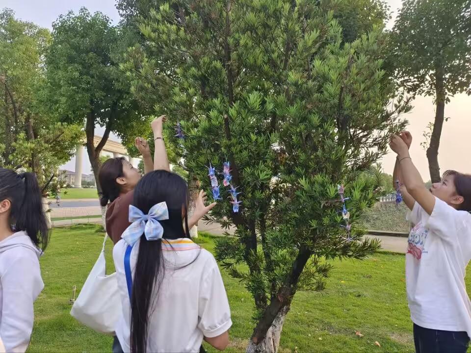 观影结束后,戴梦洁向同学们分发了白蜡烛与千纸鹤,同学们在千纸鹤上写上了美好的祝愿,挂在了屋外的树上,希望自己的一份缅怀能随着千纸鹤,传递到当年的汶川。