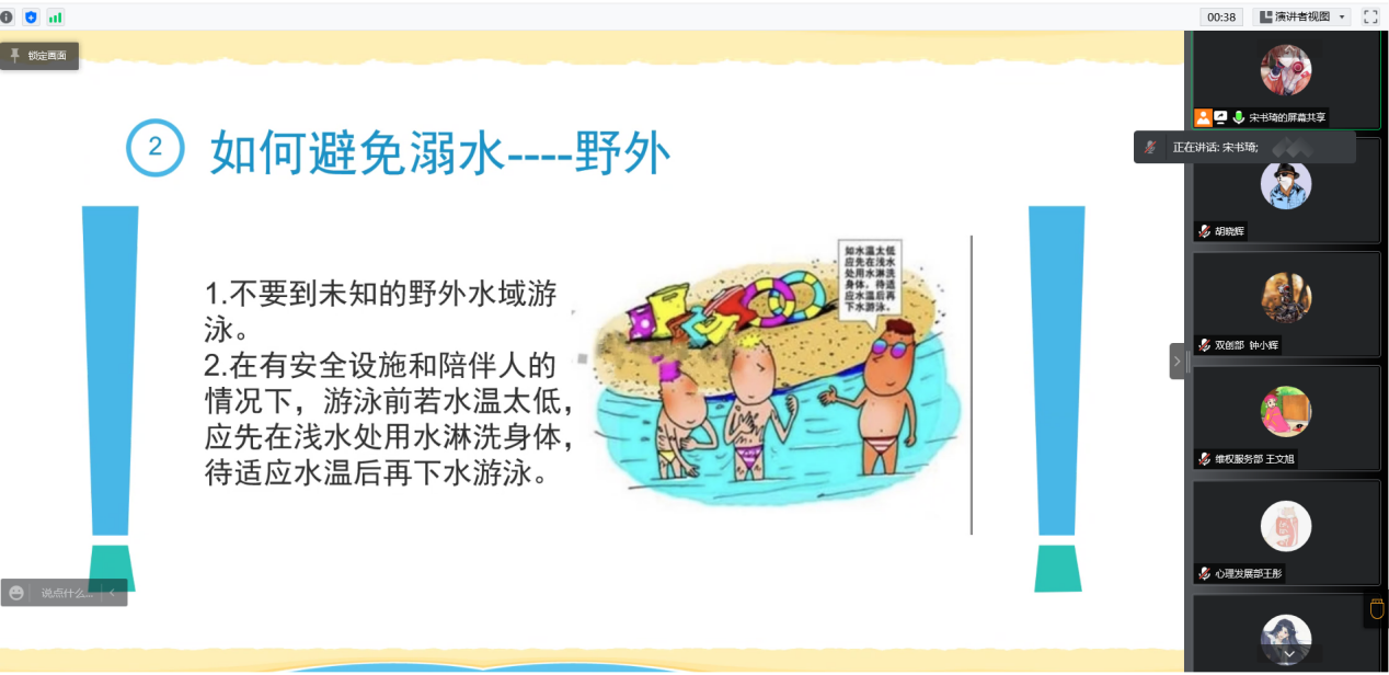 BB贝博艾弗森讯(撰稿:何魏云)为进一步加强老员工安全教育,提高BB贝博艾弗森员工的防溺水意识,充分掌握防溺水的知识和自救、施救技能,5月2日晚7:00时,BB贝博艾弗森分团委员工会组织开展了线上“老员工防溺水安全教育”主题活动,各班员工代表参加了此次活动,活动由员工会组织部宋书琦主持。