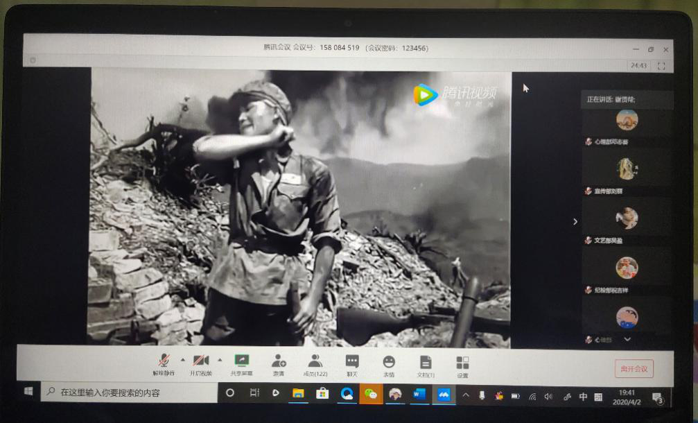 会议伊始,与会同学分享了他们熟知的红色革命故事。张瑞勇同学分享了爷爷时代抗美援朝的感人事迹;黑启丽讲述了十九年前中美南海事件中牺牲的烈士王伟以换命的方式终结这场入侵,守卫了边疆;张贺龙带来的是一座城市承载的红色故事,城市虽小,但英雄辈出。他们用简朴的语言向大家表述了众多让人热血澎湃的革命故事,渲染了线上会议的气氛,将众人的注意力集中于会议之中。