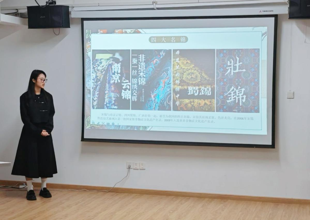 随后,公司分团委组织部负责人章傲霜带来了宋锦文化专题分享。章傲霜从宋锦的定义、品种分类、历史发展脉络等方面展开分享,详细介绍了宋锦“质地柔软、色泽光亮”的独特工艺特质,以及其作为“中国四大名锦”(与南京云锦、四川蜀锦、广西壮锦并称)、2006年入选第一批国家级非物质文化遗产名录、2009年跻身人类非物质文化遗产名录的深厚文化底蕴,使在场的团员们深刻认识到这项传统工艺的珍贵价值,激发了大家对非遗文化的探究热情。