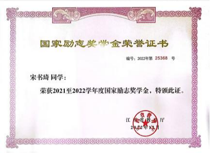 宋书琦始终保持着勤恳慎独的学习态度。通过三年的不懈努力,学习成绩始终在班级名列前茅,综测成绩保持专业第一,曾获国家励志奖学金,多次获校一等奖学金及二等奖学金;